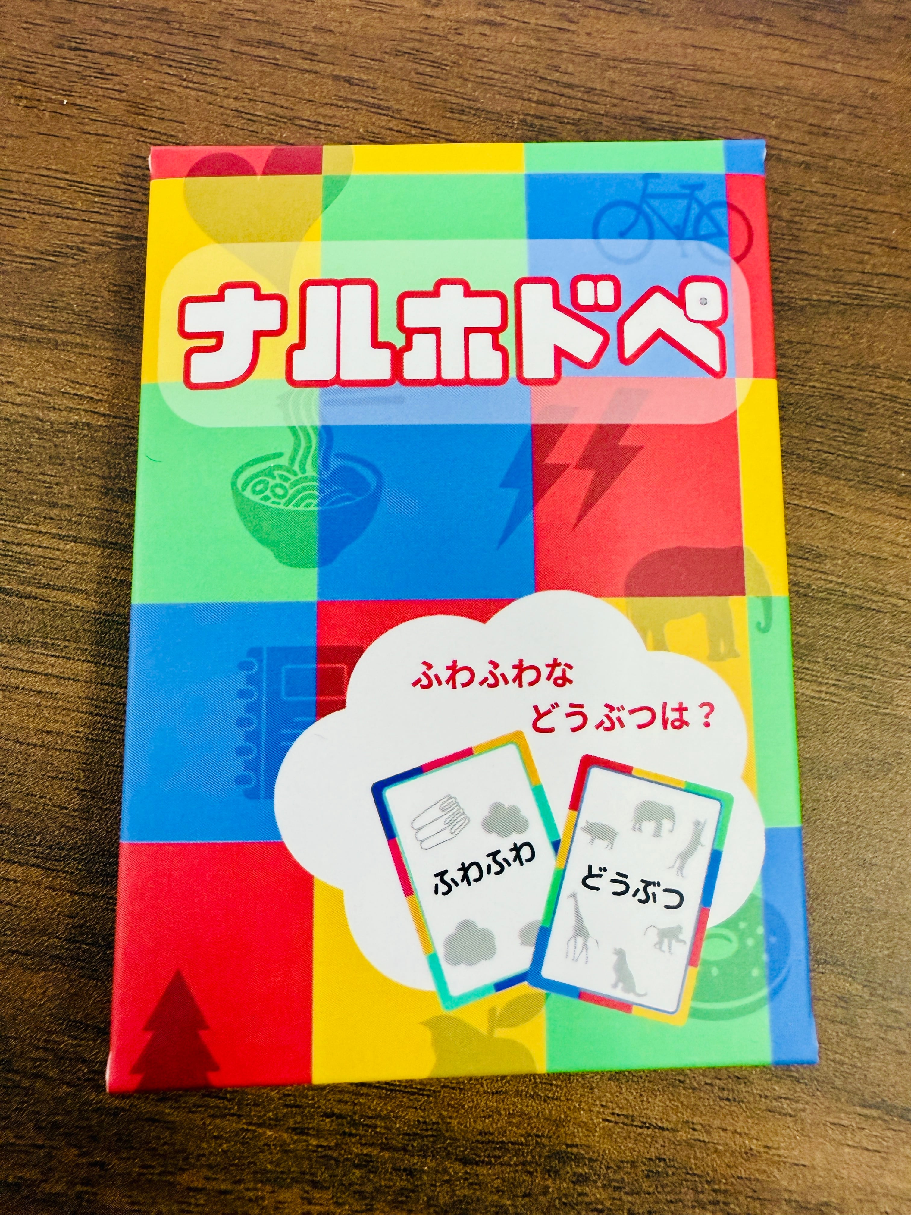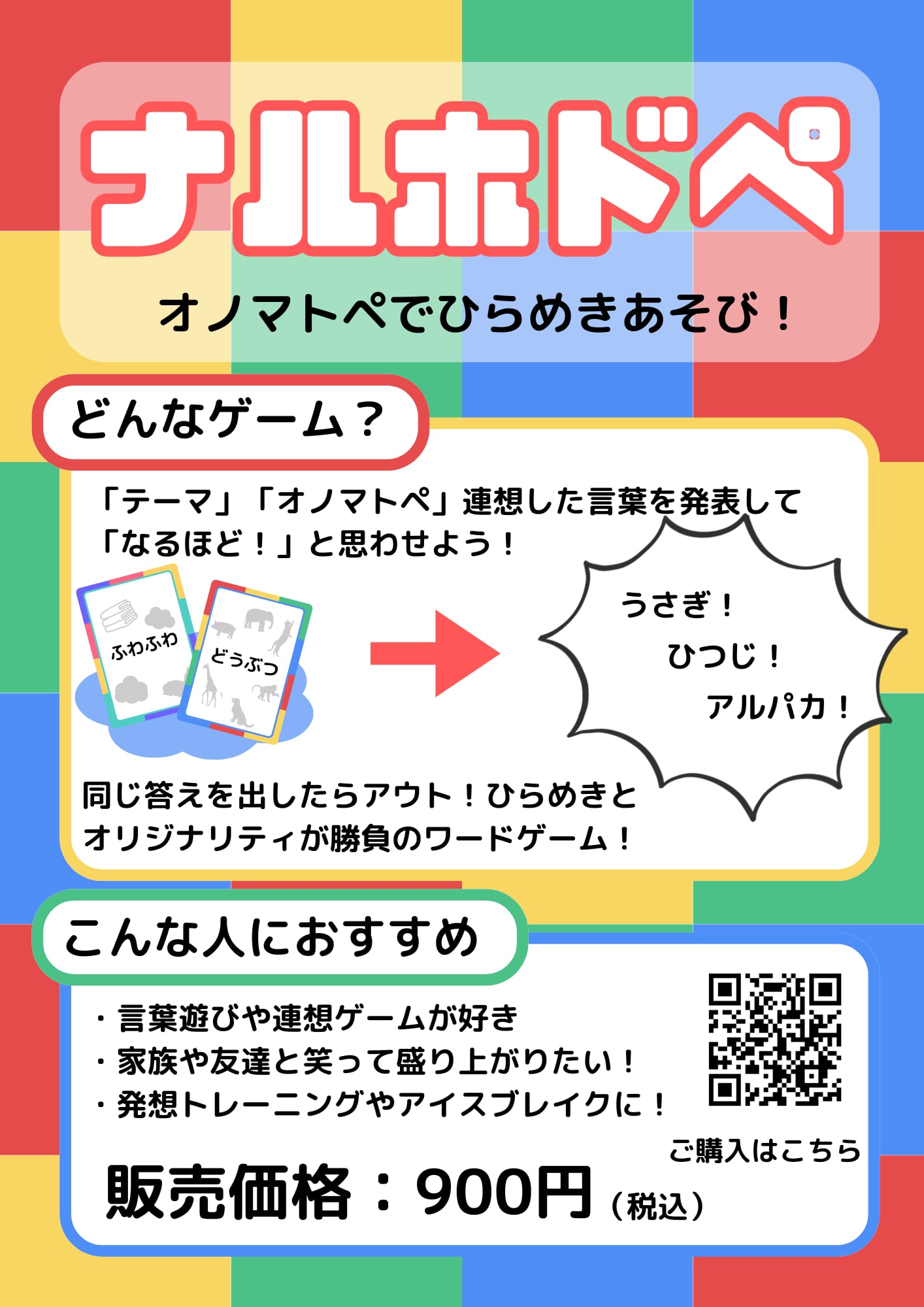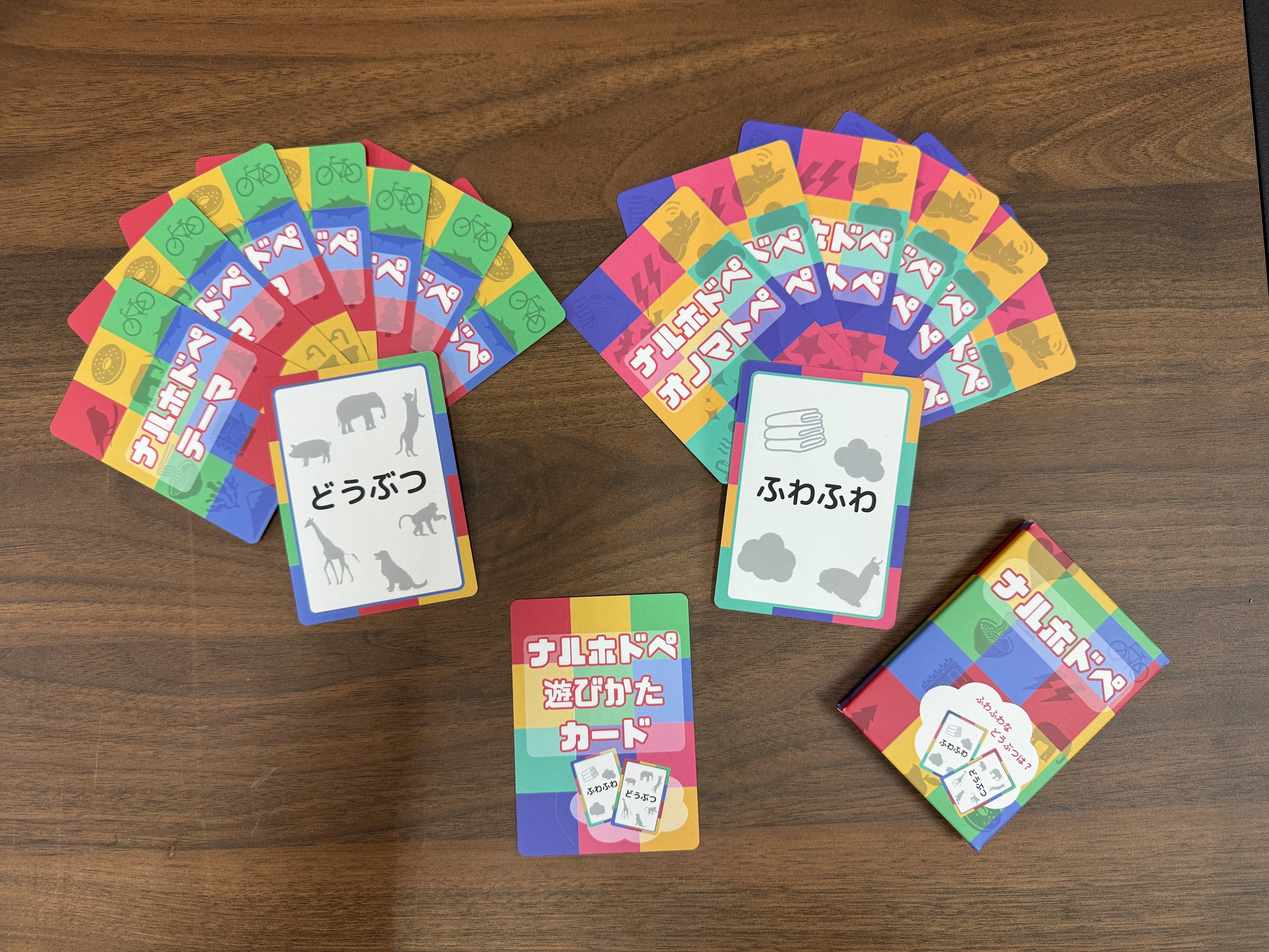 「ナルホドペ」は、テーマカードとオノマトペカードを組み合わせて、ひらめいた言葉を発表し合うカードゲームです。